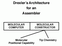Drexler’s assembler follows the von Neumann kinematic architecture, but is specialized for dealing with systems made of atoms. The essential components in Drexler’s assembler are shown in figure 2. The emphasis here (in contrast to von Neumann’s proposal) is on small size. The computer and constructor both shrink to the molecular scale, while the constructor takes on additional detail consistent with the desire to manipulate molecular structures with atomic precision. The molecular constructor has two major subsystems: (1) a positional capability and (2) the tip chemistry.